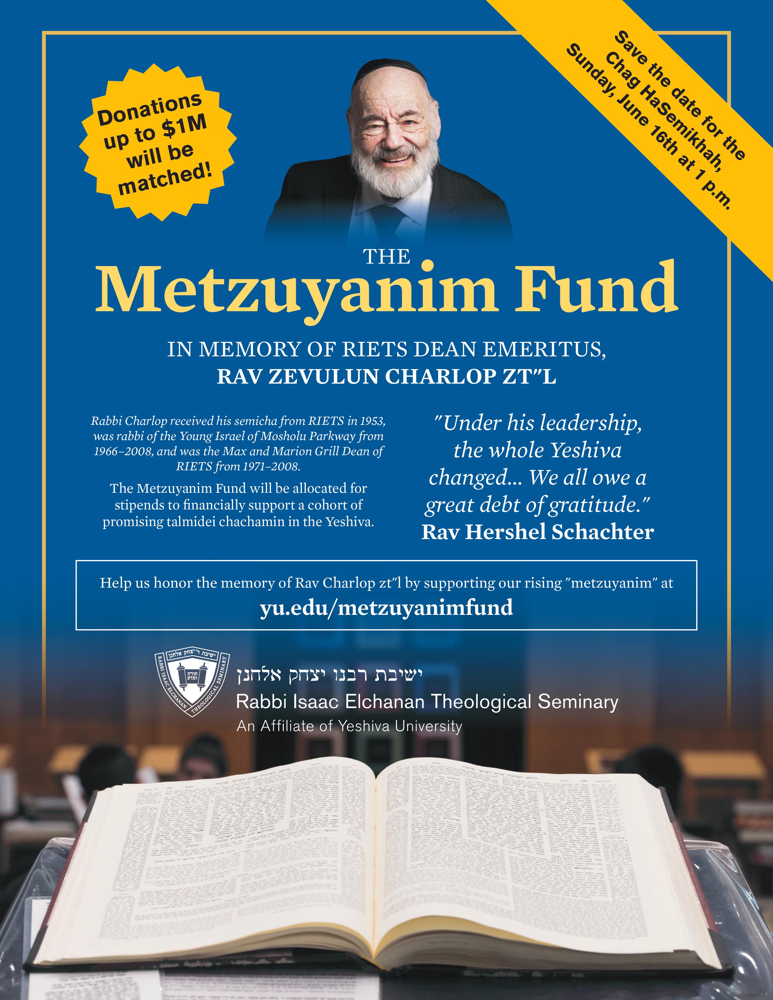 Our Dean Emeritus, Rabbi Zevulun Charlop Zt"l, was a pillar of the RIETS community for decades and aided countless talmidim (or, as he would say, "metzuyanim") on their path to becoming rabbanim. As we prepare to celebrate the Chag HaSemikhah, we are privileged to establish the Metzuyanim Fund in his memory to financially support a yearly cohort of promising talmidei chachamim learning in our kollel. Thanks to a generous donor, contributions will be matched up to $1 million! Please consider supporting our rising metzuyanim in order to continue the tradition of excellence and success in learning that Rabbi Charlop embodied. Donations can be made at https://ru.8xgi5.shop/MetzuyanimFund